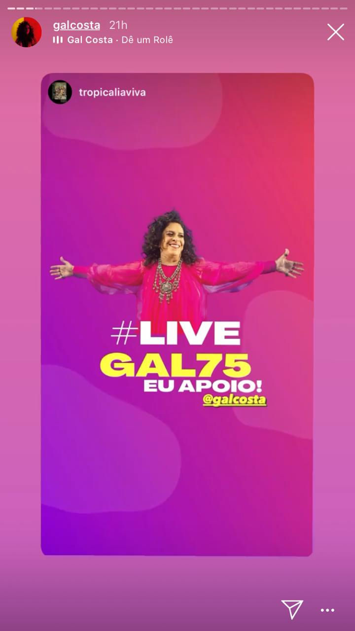 Depois do sucesso das lives de Gilberto Gil e Caetano Veloso, no dia de seus respectivos aniversários, os fãs da também tropicalista Gal Costa iniciaram uma campanha nas redes sociais para que a cantora faça uma apresentação virtual.